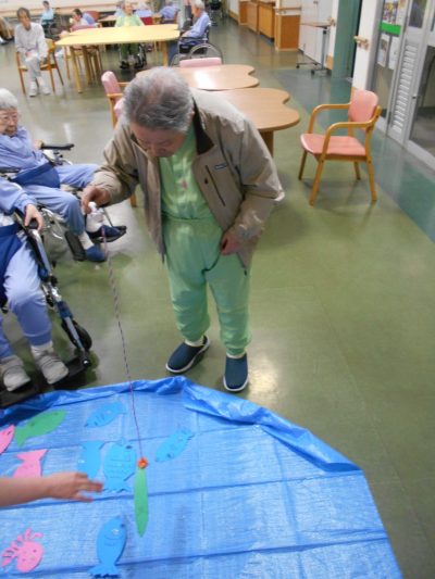 プールに見立ててブルーシートを敷き、その上に画用紙で作った魚を泳がせて魚つりをしました。